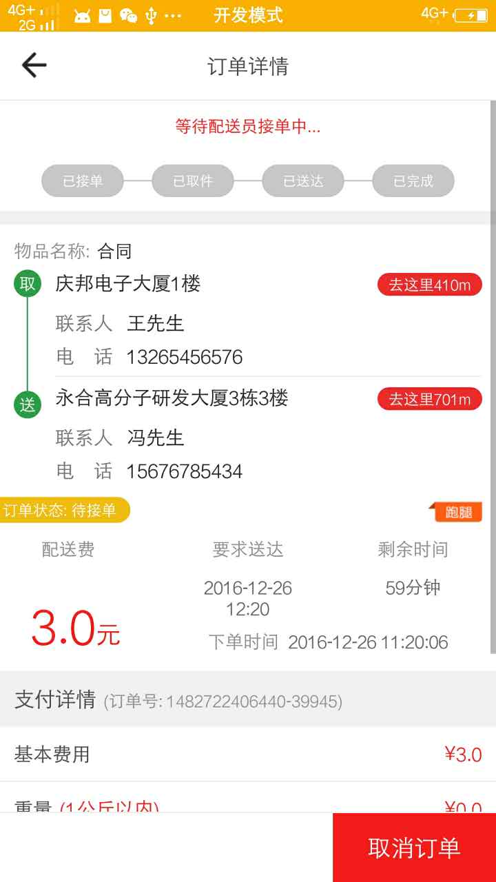 配送员接单后由于自身原因无法按时取件,可自行取消订单,订单再次重新分配。